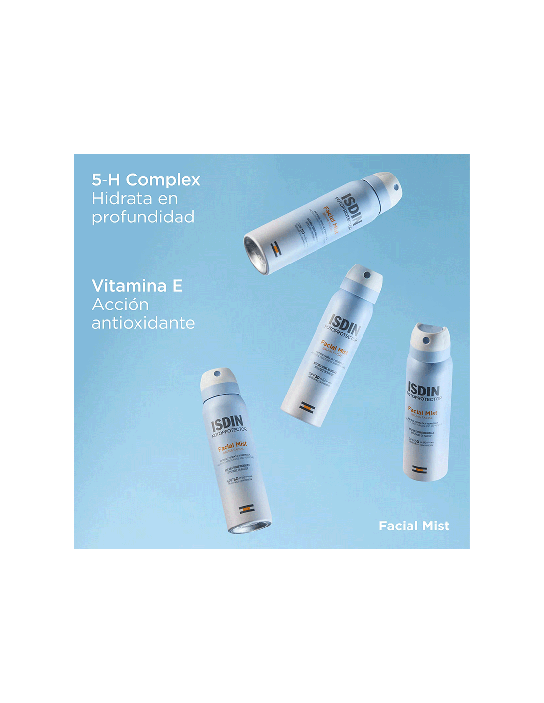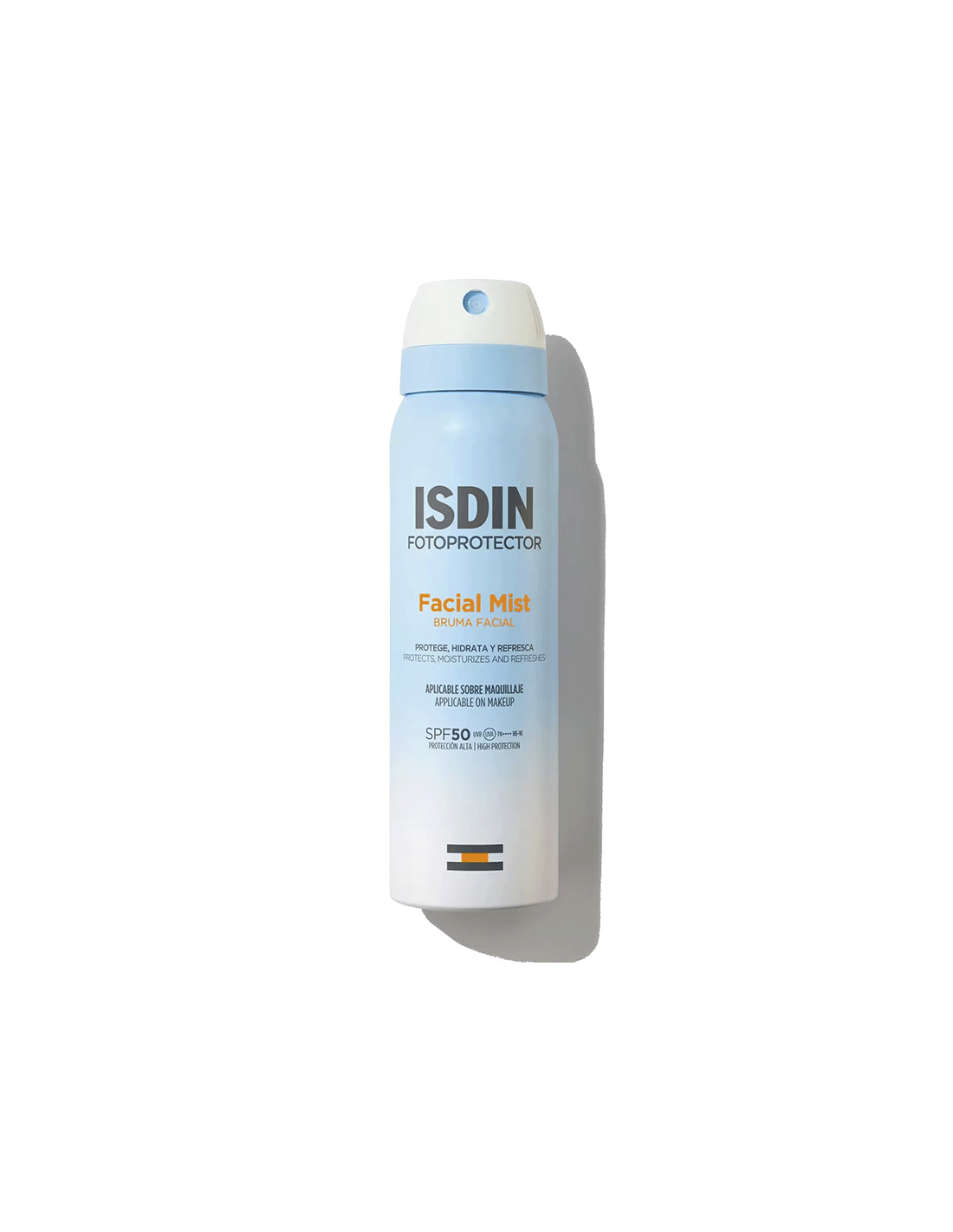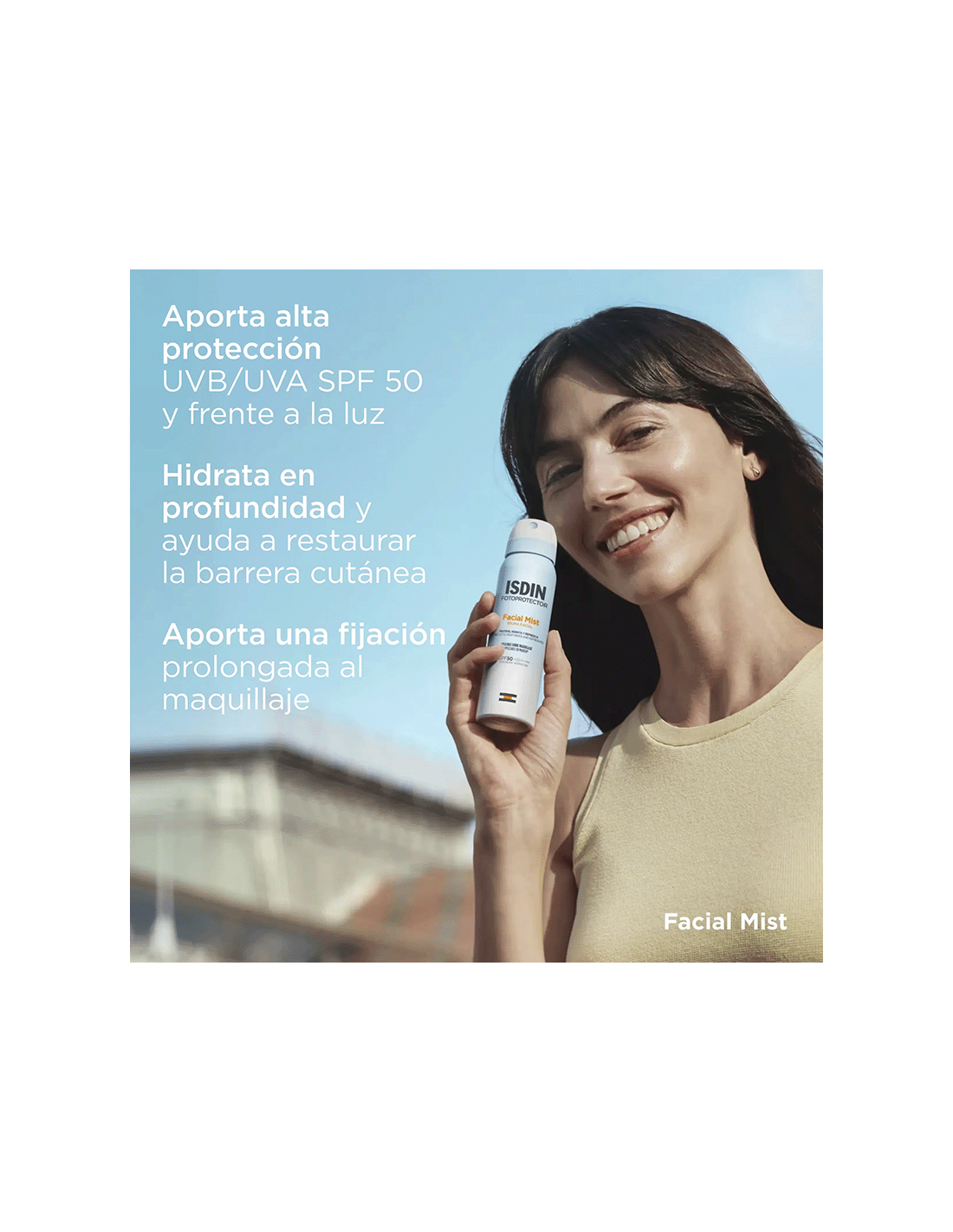 Protege, hidrata y refresca tu piel con Facial Mist SPF 50, el fotoprotector facial que se pulveriza en forma de bruma facial invisible y ultrafina. Aporta una alta protección frente a la radiación UVB/UVA y la luz azul, hidrata en profundidad y ayuda a restaurar la barrera cutánea. ¡Ideal para usar sobre el maquillaje!